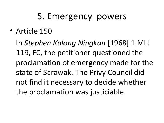 The chief minister, mr stephen kalong ningkan, a tough iban leader, won the first round, and the leaders of. He also opposed the national language and education policy. A most recent example was the recent constitutional crisis in perak last. As the executive of a newly independent state which helped to form malaysia, ningkan faced many challenges from within the state and from sarawak's neighbour, indonesia. Case review of stephen kalong ningkan v tun abang haji openg and tawi sli 1966 2 mlj 187.view more.
